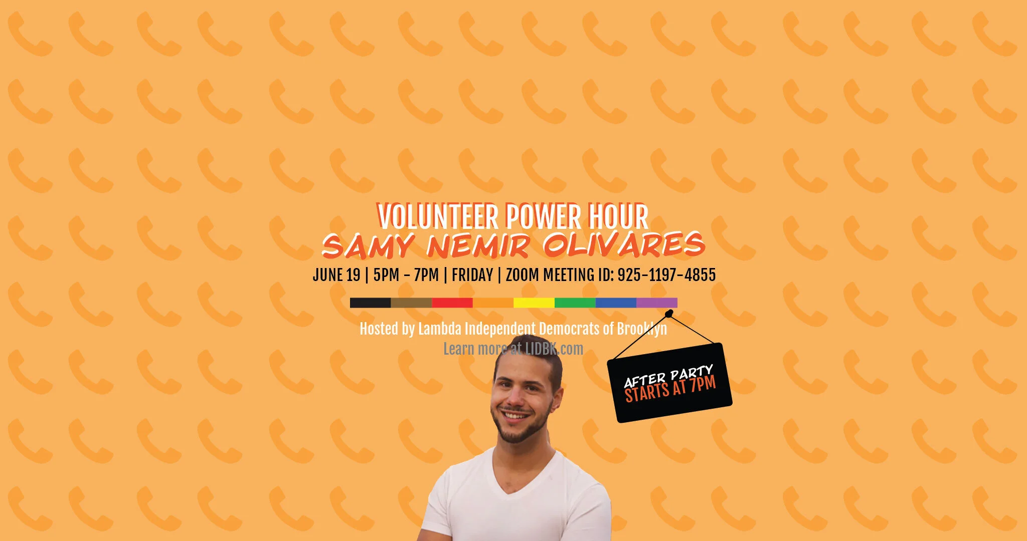 Virtual Power Hour for Samy Nemir Olivares + LID Happy Hour Friday, June 19, 2020 5:00 PM 8:00 PM 17:00 20:00 Google Calendar ICS JOIN VIA ZOOM Come make calls for OUT LGBTQ candidate Samy Nemir Olivares! Stay for our weekly LID HAPPY HOUR at 7PM.